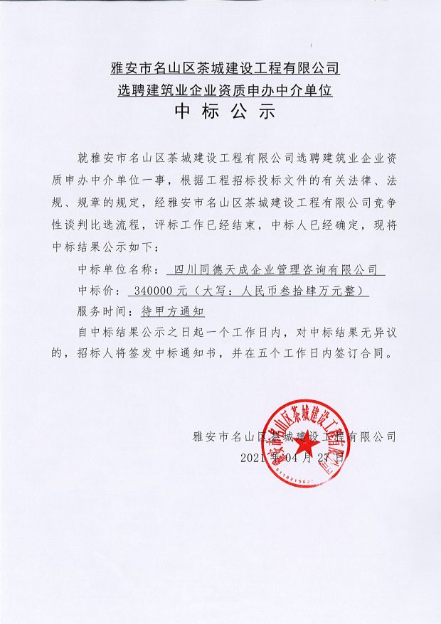 選聘建筑企業資質申辦中介單位中標公示